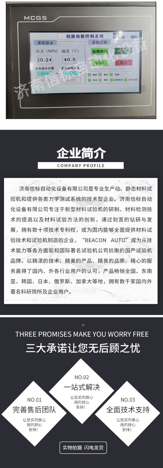 濟南信標自動化設備有限公司主要生產:動靜態萬能疲勞試驗機,接骨板彎曲試驗機,縫合線拉伸疲勞試驗機,髖膝關節磨損試驗機,電子萬能試驗機、液壓萬能試驗機、巖石三軸、四軸,電液拉力試驗機,材料試驗機,高低溫蠕變,高低頻疲勞,拉伸、扭轉、杯突等二十多個系列兩千多個的品種。