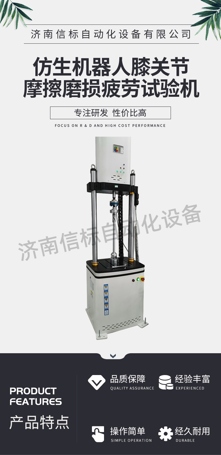 濟南信標自動化設備有限公司主要生產:動靜態萬能疲勞試驗機,接骨板彎曲試驗機,縫合線拉伸疲勞試驗機,髖膝關節磨損試驗機,電子萬能試驗機、液壓萬能試驗機、巖石三軸、四軸,電液拉力試驗機,材料試驗機,高低溫蠕變,高低頻疲勞,拉伸、扭轉、杯突等二十多個系列兩千多個的品種。