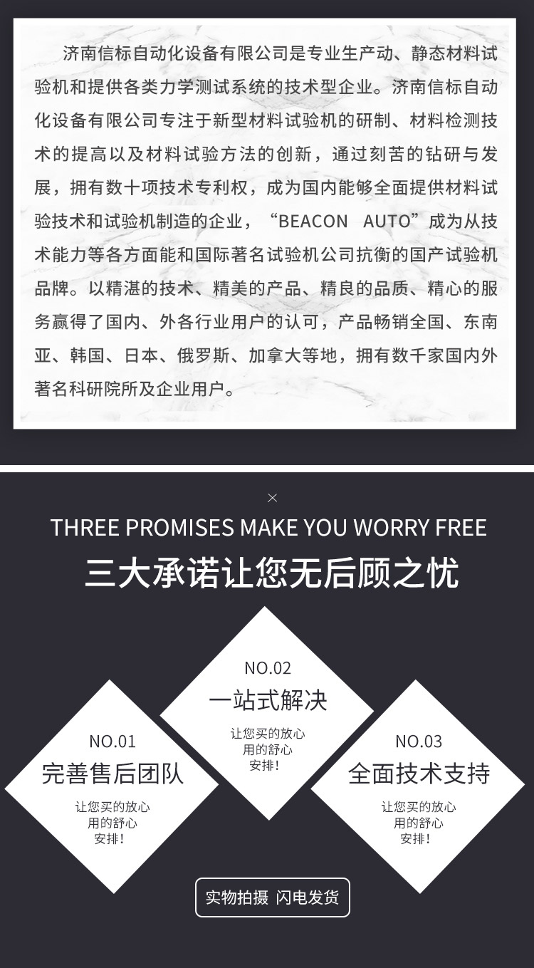 濟南信標自動化設(shè)備有限公司主要生產(chǎn):動靜態(tài)萬能疲勞試驗機,接骨板彎曲試驗機,縫合線拉伸疲勞試驗機,髖膝關(guān)節(jié)磨損試驗機,電子萬能試驗機、液壓萬能試驗機、巖石三軸、四軸,電液拉力試驗機,材料試驗機,高低溫蠕變,高低頻疲勞,拉伸、扭轉(zhuǎn)、杯突等二十多個系列兩千多個的品種。