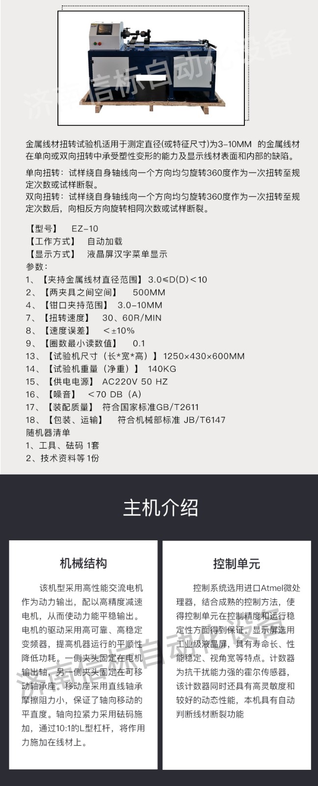 金屬線材扭轉(zhuǎn)試驗機適用標(biāo)準(zhǔn): 金屬線材扭轉(zhuǎn)試驗機適用于中華人民共和國標(biāo)準(zhǔn)GB/T 239.1-2012《金屬材料 線材 第一部分 單向扭轉(zhuǎn)試驗方法》、GB/T 239.2-2012《金屬材料 線材 第二部分 雙向扭轉(zhuǎn)試驗方法》,也適用于國際標(biāo)準(zhǔn)ISO 7800:2003《金屬線材單向扭轉(zhuǎn)試驗方法》和ISO 9649:1990《金屬線材雙向扭轉(zhuǎn)試驗方法》。 金屬線材扭轉(zhuǎn)試驗機應(yīng)用領(lǐng)域: 該機主要用于大專院校、科研部門、工礦企業(yè)的力學(xué)實驗室的金屬線材的力學(xué)性能分析,也廣泛用于生產(chǎn)單位的在線檢測;主要行業(yè)有鋼廠高速線、預(yù)應(yīng)力鋼絲廠、質(zhì)量監(jiān)督、科研院所、公路交通、建筑行業(yè)、鋼絲繩、電線電纜、電氣化鐵道用銅及銅合金導(dǎo)線、銅接觸線等生產(chǎn)和使用部門。 金屬線材扭轉(zhuǎn)試驗機主機介紹: 1、機械結(jié)構(gòu): 該機型采用高性能交流電機作為動力輸出,配以高精度減速電機,從而使動力能平穩(wěn)輸出。電機的驅(qū)動采用高可靠、高穩(wěn)定變頻器,提高機器運行的平順性,降低功耗。一側(cè)夾頭固定在電機輸出軸,另一側(cè)夾頭固定在可移動軸承座。移動座采用直線軸承,摩擦阻力小,保證了軸向移動的平直度。軸向拉緊力采用砝碼施加,通過10:1的L型杠桿,將作用力施加在線材上。 2、控制單元: 控制系統(tǒng)選用進(jìn)口Atmel微處理器,結(jié)合成熟的控制方法,使得控制單元在控制精度和運行穩(wěn)定性方面得到保證。